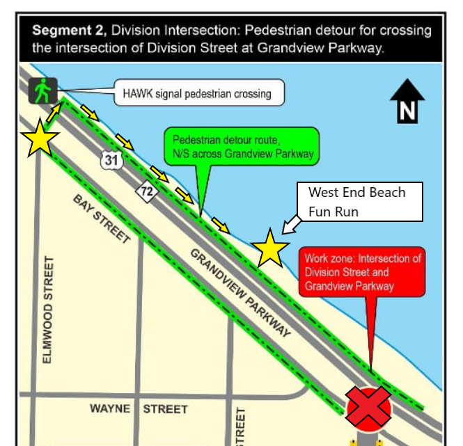 Pedestrian detour update for West End Beach - The pedestrian crossing at Division and Grandview Parkway is CLOSED due to construction. We recommend using the HAWK crossing at the end of Elmwood Street and Grandview/Bay St to safely access West End Beach. See you at 6:30pm Monday!